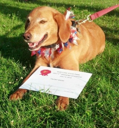 Koby recently won a prize for catching treats - your homemade peanut butter treats, oh course! We were camping at a state park over the 4th of July weekend and they had a dog show. Koby took second place in Talent for a game we play that I call Catch-a-Treat, too cute!! I've attached a photo - he's such a happy boy! LoL"